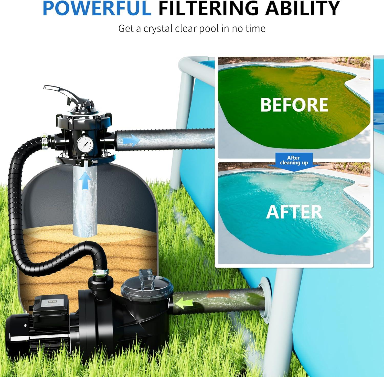 Maximum Flow Rate: With an impressive flow rate of 3800GPH, Foting sand filterpump is ideal for pools up to 13000 gallons, ensuring swift and thorough water filtration.