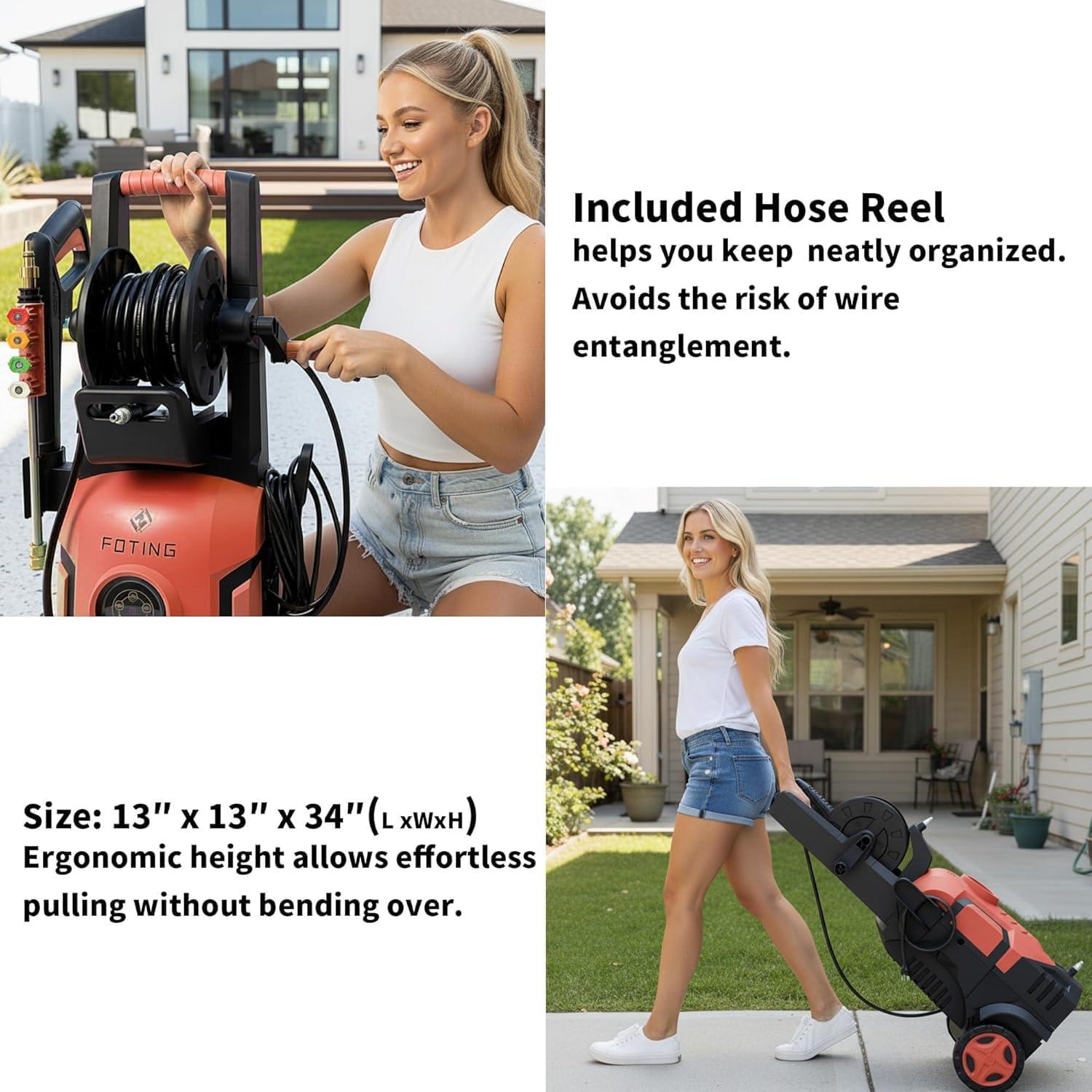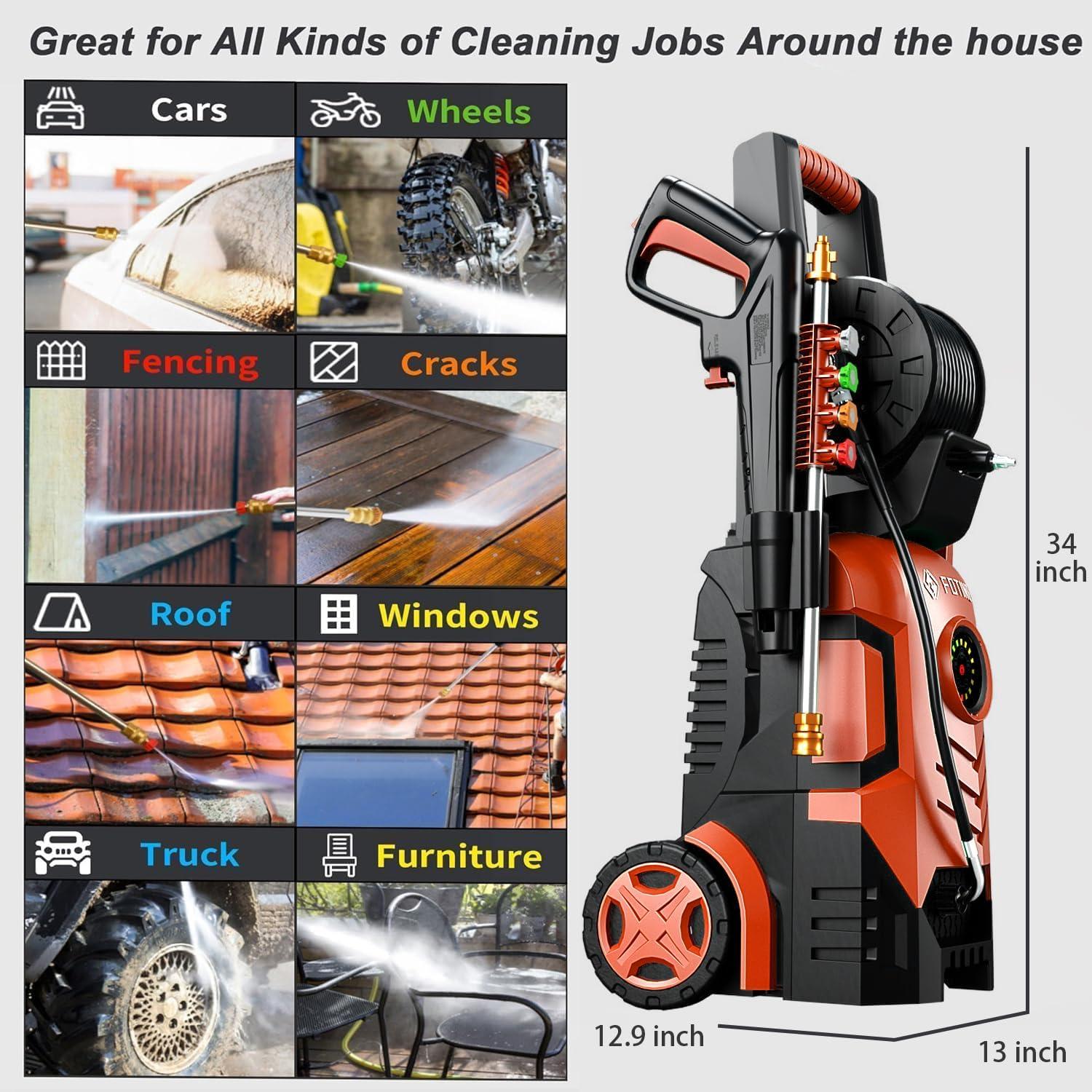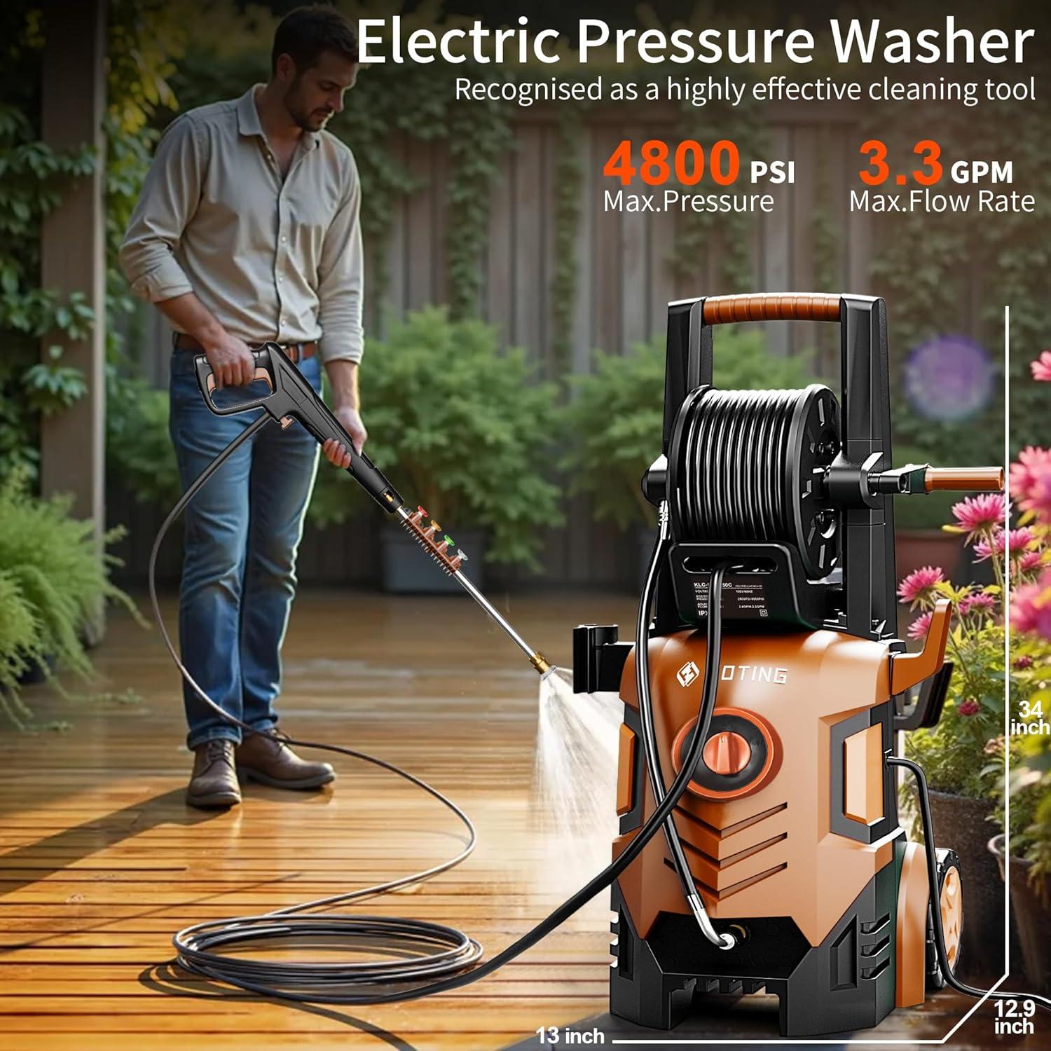 4800 PSI MAX PRESSURE: FOTING pressure washer delivers a powerful 4800 PSI water pressure at 3.3 GPM for maximum cleaning power.Quickly and easily cleaning decks, terraces, driveways, siding, sheds, cars, outdoor power equipment as well.