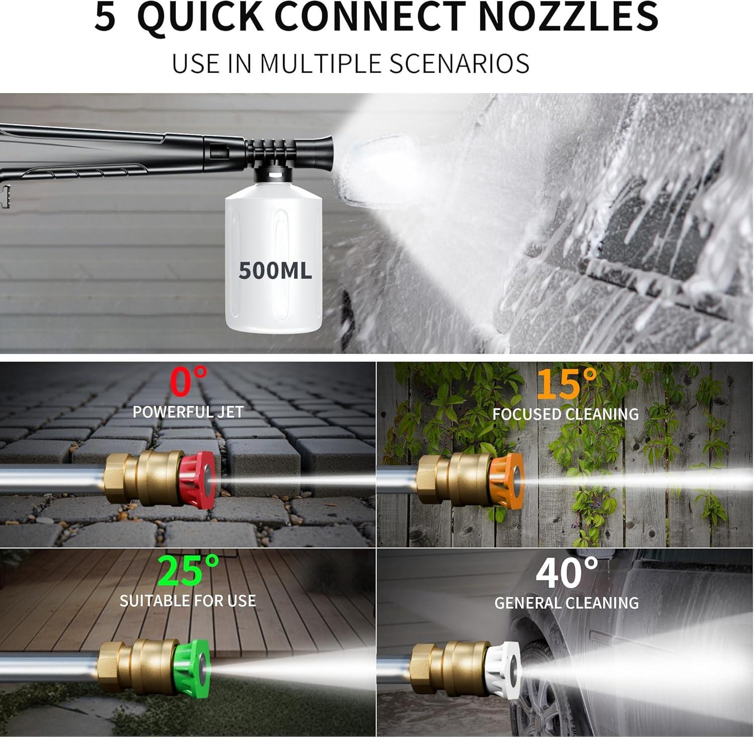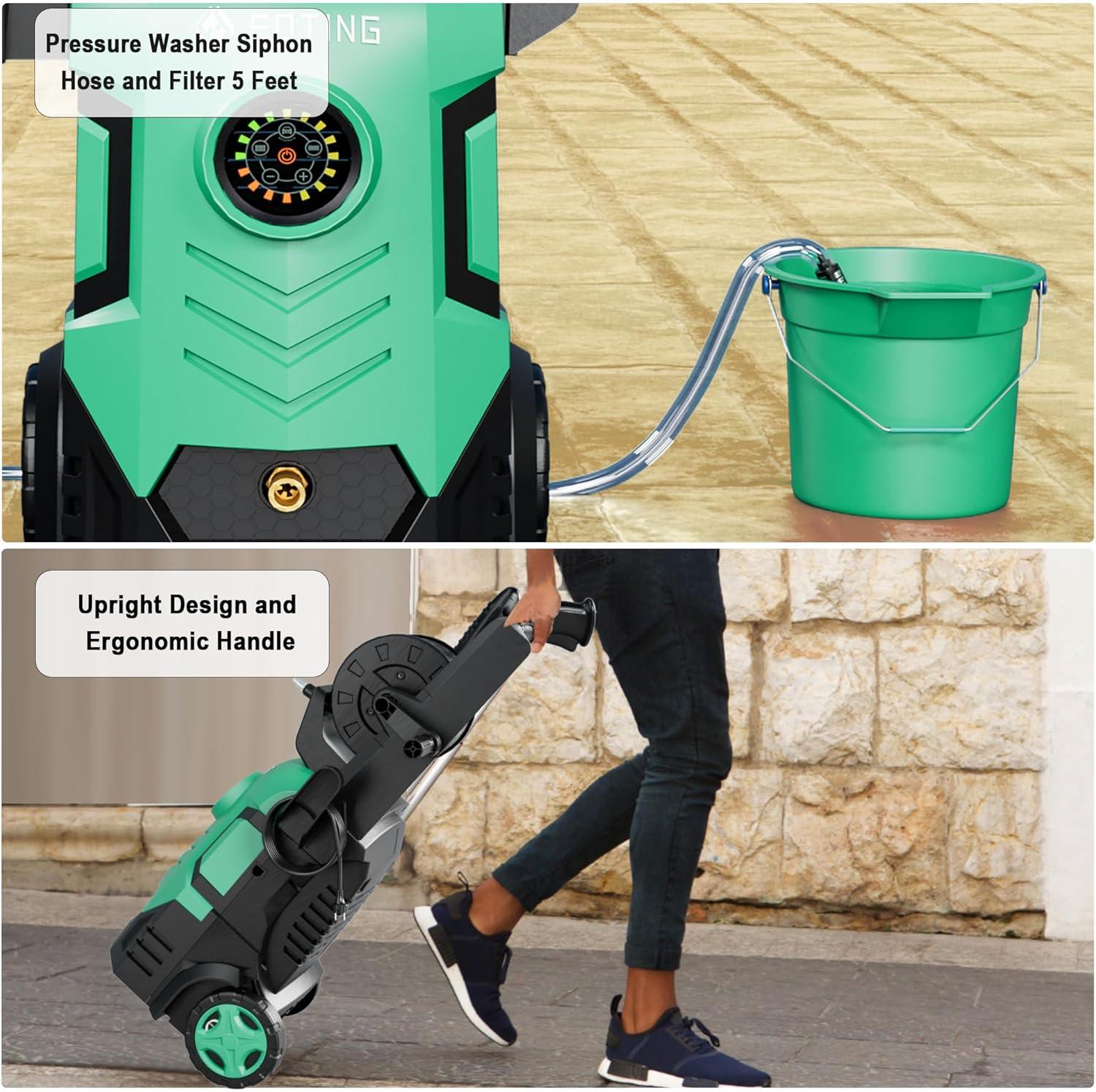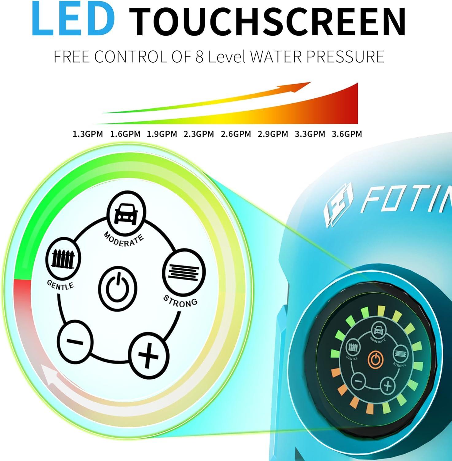 Smart Touchscreen Control: Easily adjust cleaning power with the waterproof touchscreen, selecting from 8 pressure levels (2500-5000 PSI). Includes soap bottle & 4 nozzles.
