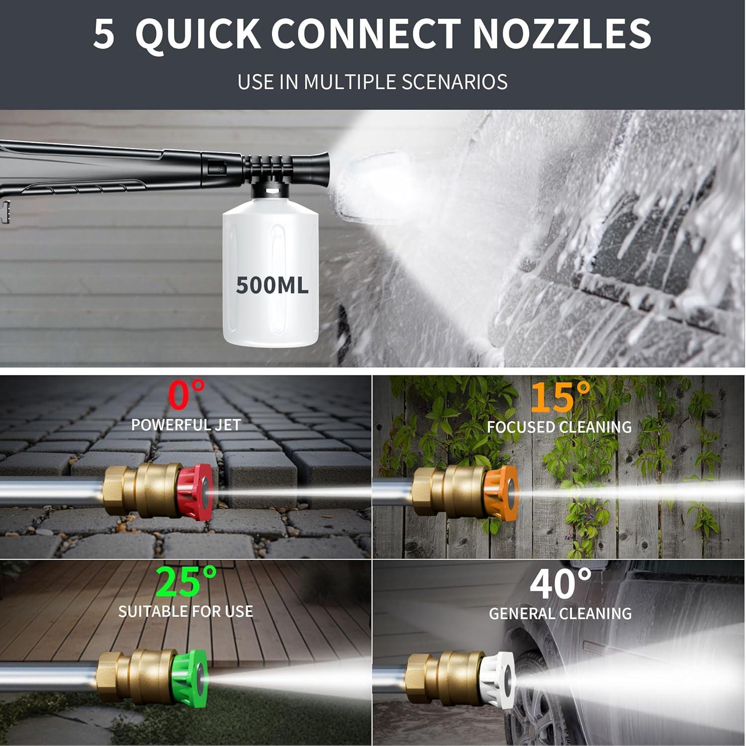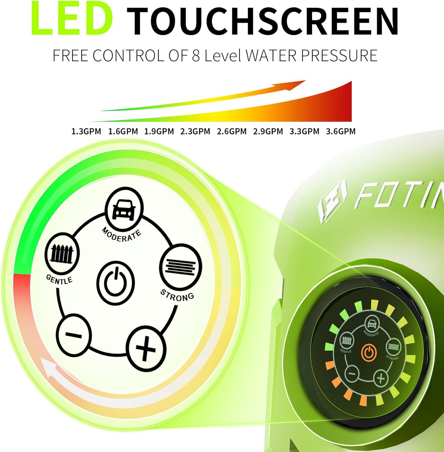 Smart Touchscreen Control: Easily adjust cleaning power with the waterproof touchscreen, selecting from 8 pressure levels (2500-5000 PSI). Includes soap bottle & 4 nozzles.