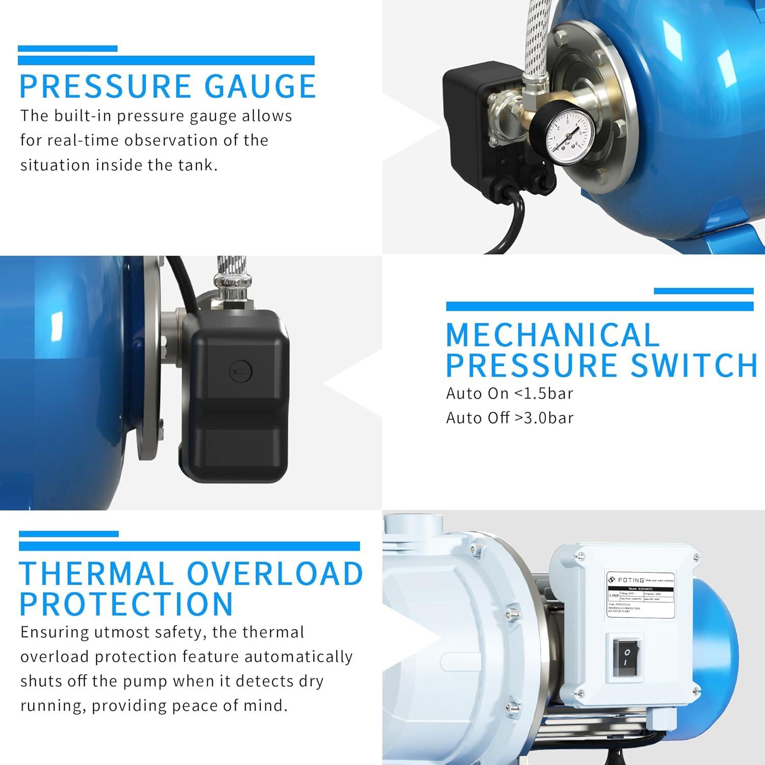 【Easy to Use】FOTING shallow well jet pump has 6.6FT power cable and easy-to-carry handle. You can use it indoor or outdoor, please just plug in to the 115V AC power source. It comes with the 1″ NPT outlet and inlet for easy hook up.(Water hoses are not included.) Fill with water when using for the first time.