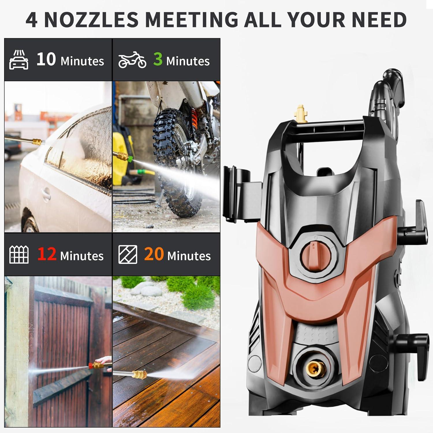 【ADJUSTABLE PRESSURE NOZZLE】: Adjustable Pressure Nozzle is equipped with 4 quick-connect spray tips (0°, 15°, 25°, and 40°) Whether light, medium, or heavy-duty cleaning, simply select appropriate pressure washer nozzle to tackle the task at hand. Simplify FOTING cleaning routine and achieve efficient results