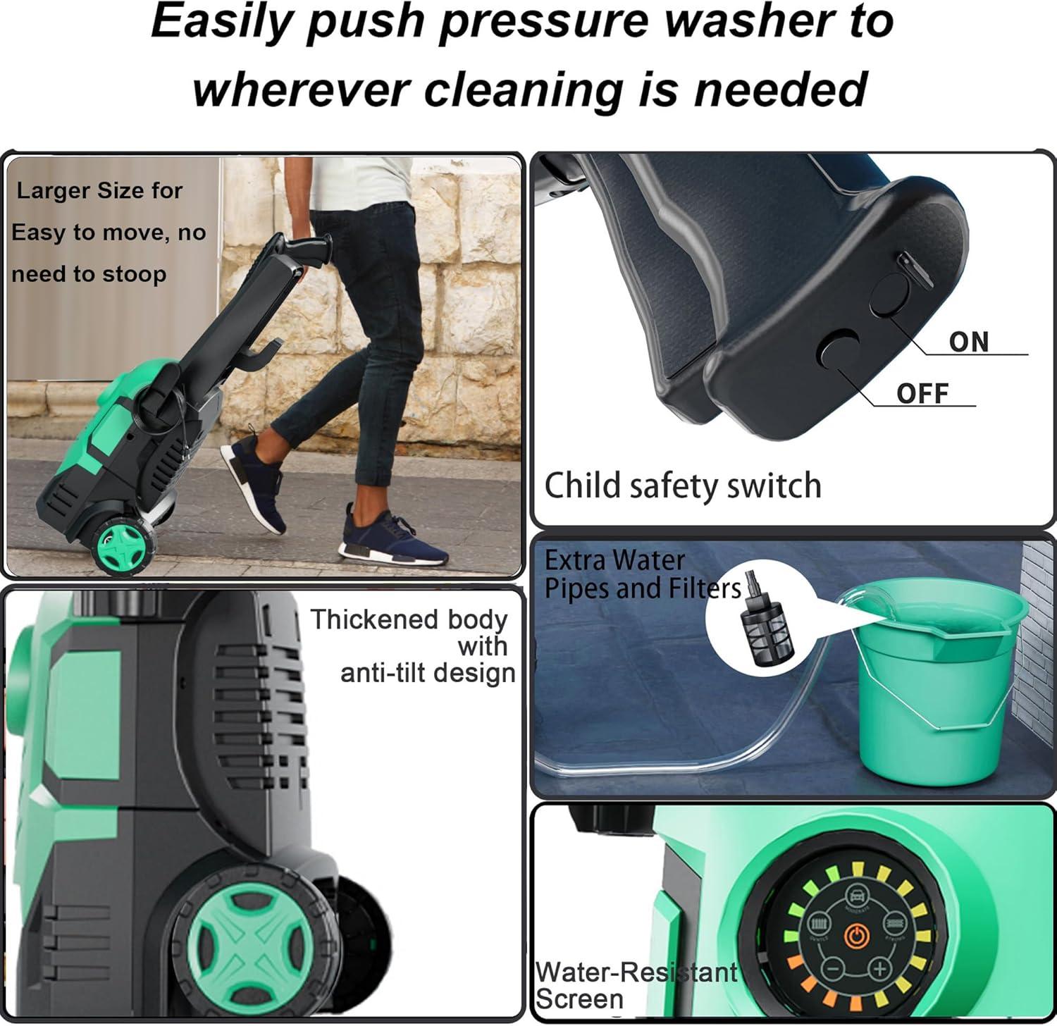 UPGRADED TOUCHSCREEN INTERFACE: Features 8 pressure levels controlled by a user-friendly touch screen, Pressure adjusted from 2500PSI to 5000PSI; includes soap bottle and 4 nozzles for versatile cleaning.
