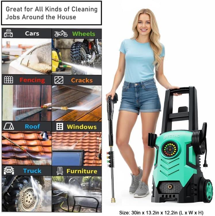 5000 PSI MAX PRESSURE: FOTING pressure washer delivers a powerful 5000 PSI water pressure at 3.3 GPM for maximum cleaning power.Quickly and easily cleaning decks, terraces, driveways, siding, sheds, cars, outdoor power equipment as well.
