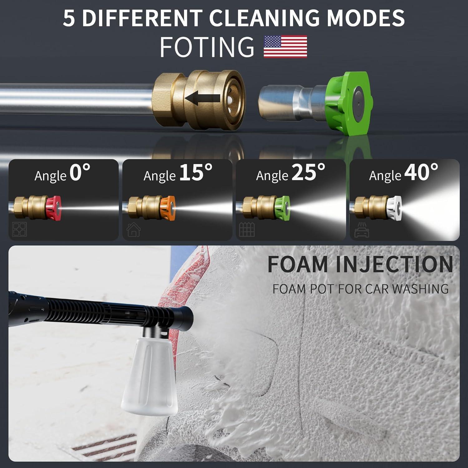 【ADJUSTABLE PRESSURE NOZZLE】: Adjustable Pressure Nozzle is equipped with 4 quick-connect spray tips (0°, 15°, 25°, and 40°) Whether light, medium, or heavy-duty cleaning, simply select appropriate pressure washer nozzle to tackle the task at hand. Simplify FOTING cleaning routine and achieve efficient results