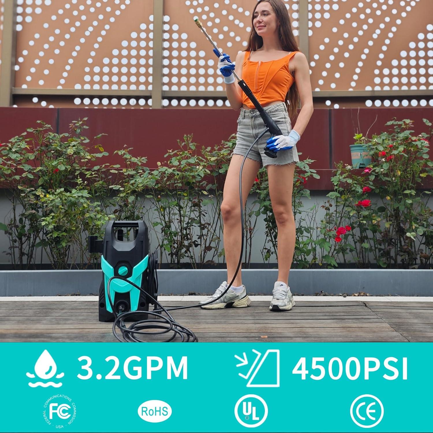 【4200PSI PRESSURE WASHER】: Maximum pressure up to 4200PSI, powerful universal motor generates max 4200 PSI water pressure at 2.8 GPM water flow for max cleaning power. Quickly and easily cleaning decks, terraces, driveways, siding, sheds, cars, outdoor power equipment as well